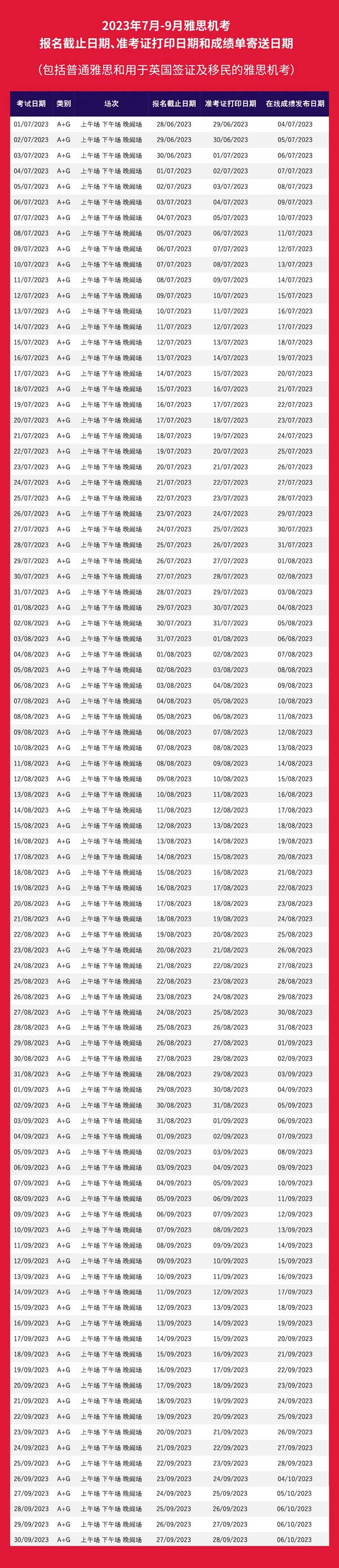2023年7月-9月普通雅思和用于英國簽證及移民的雅思機(jī)考報(bào)名截止日期、準(zhǔn)考證打印日期和成績(jī)單寄送日期: